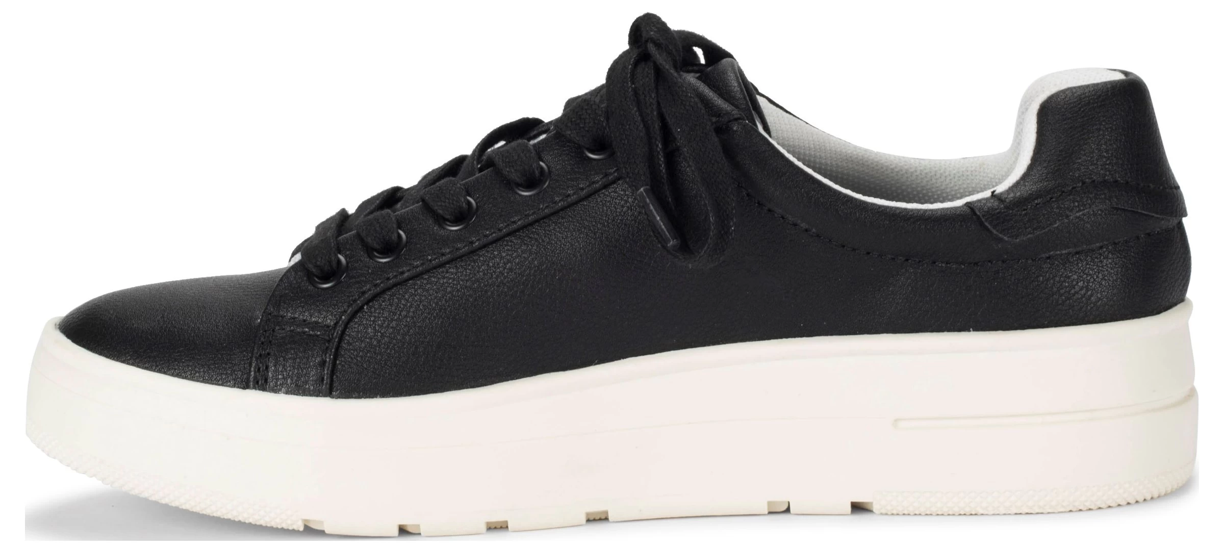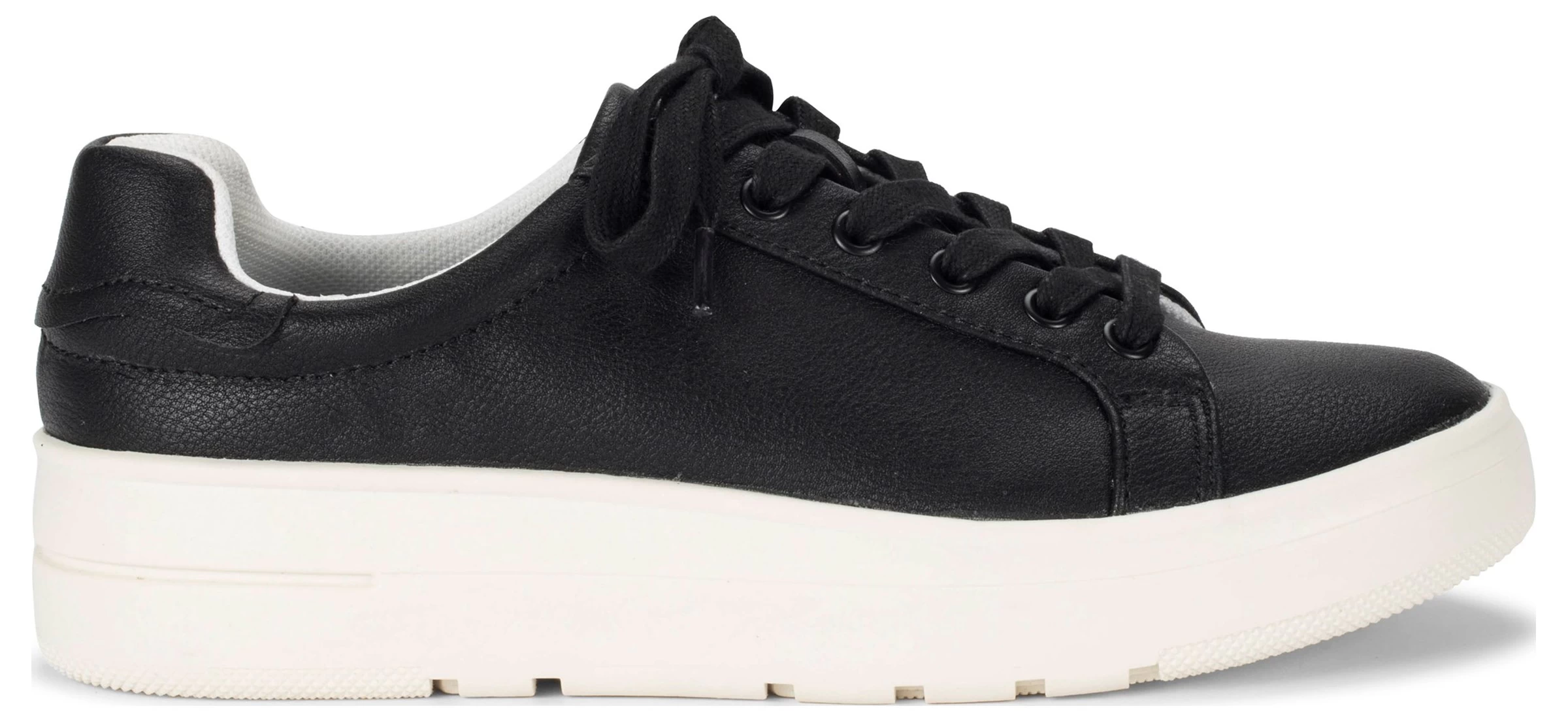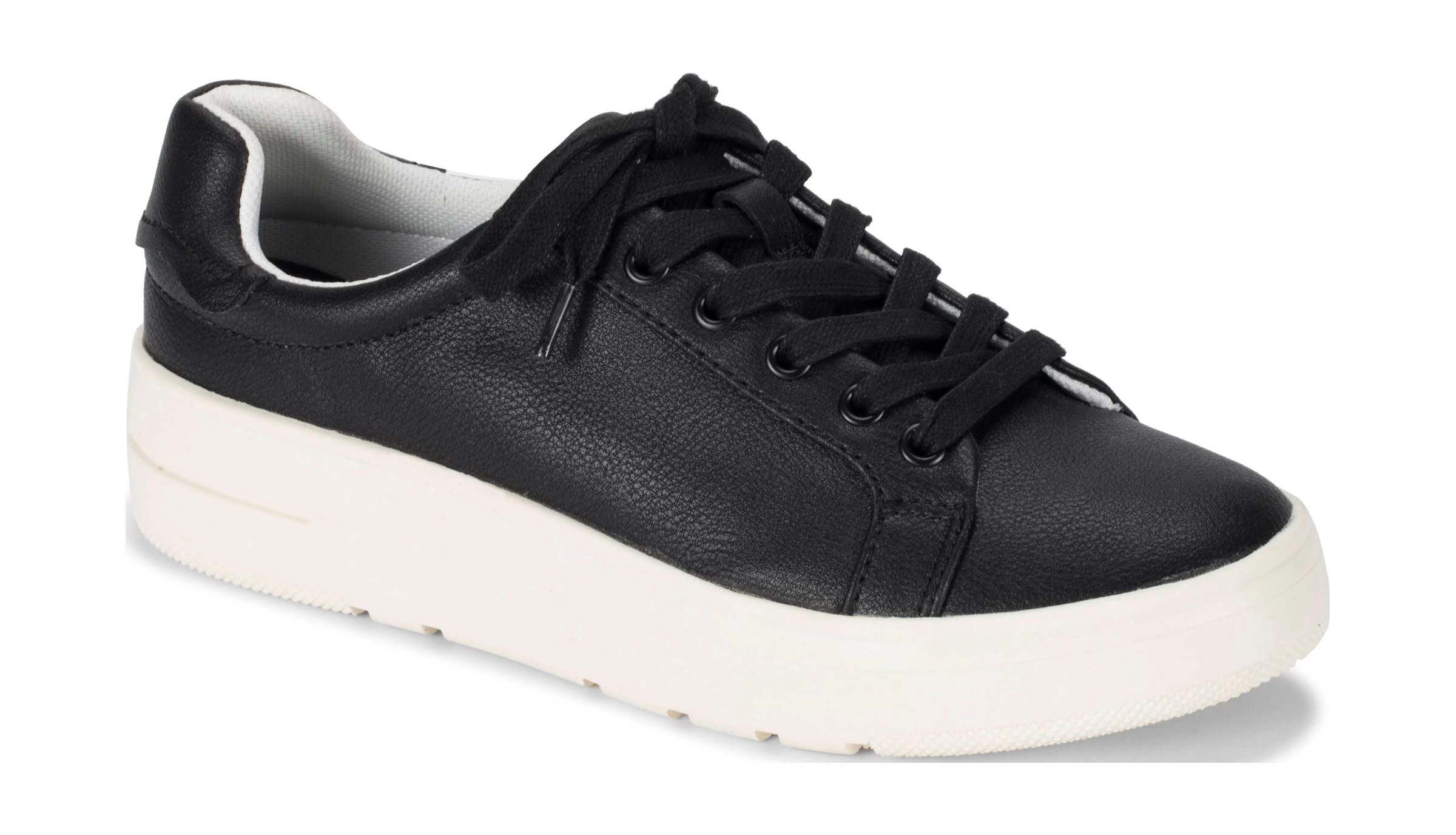 - Faux leather or canvas upper in a sneaker style with a round toe.